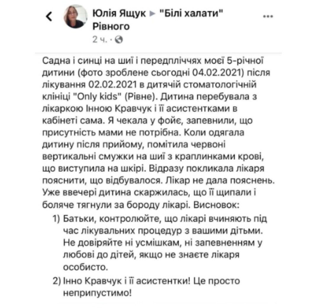 Кроме этого в группе был еще один пост, позже удаленный администраторами, в котором еще одна жительница Ровно, Юлия Яцук, утверждала, что после приема в детской стоматологии Only kids, ее 5-летняя дочь вышла из ссадинами и синяками на шее. Женщина уверена, врач Инна Кравчук и его ассистенты нанесли телесные повреждения ее ребенку. Причем на приеме матери запретили присутствовать и выставили ее из кабинета.
