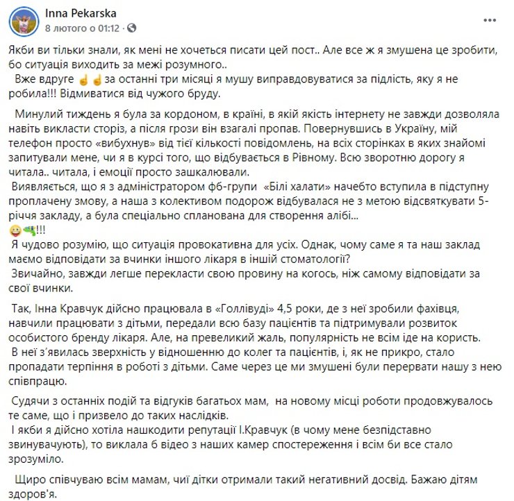 "Инна Кравчук действительно работала в "Голливуде" 4,5 года, где из нее сделали специалиста, научили работать с детьми, передали всю базу пациентов и поддерживали развитие личного бренда врача. Но, к сожалению, популярность не всем идет на пользу. У нее появилось превосходство в отношении коллег и пациентов, и, как ни прискорбно, стало пропадать терпение в работе с детьми. Именно поэтому мы вынуждены были прервать наше с ней сотрудничество. Судя по последним событиям и отзывов многих мам, на новом месте работы продолжалось то же, что и привело к таким последствиям. И если бы я действительно хотела навредить репутации И. Кравчук (в чем меня безосновательно обвиняют), то выложила бы видео с наших камер наблюдения и всем бы все стало понятно. Искренне сочувствую всем мамам, чьи дети получили такой негативный опыт. Желаю детям здоровья", — написала Пекарская.