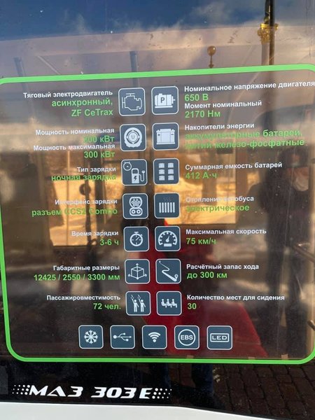 Электробус имеет запас хода в 270-320 км, зарядка автобуса емкостью 415 Ампер в час при полной разрядке займет 6-7 часов. Двигателем в электробусе выступает электрическая установка немецкой компании ZF CeTrax, мощностью в 300 кВт. Максимальная скорость электробуса — 75 км/ч. Среди других особенностей электроавтобуса выделяют низкий пол, салон, который рассчитан на 30 сидячих мест и до 70 пассажиров всего.