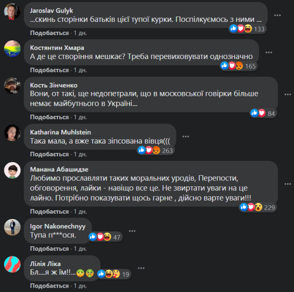 "Скинь страницы родителей этой туп*й курицы. Пообщаемся с ними", "А где это создание живет? Надо перевоспитывать однозначно", "Да она просто примитивная девочка! Родителям выговор. Воспитать такого неготового к будущему ребенка надо еще уметь!", "Так и хочется собрать вещи и выслать ее ,"бандеролью ʼ туда, на чьем языке она так "хорошо разговаривает".