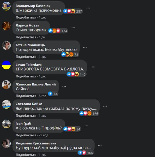 "Но когда у нас в Украине идет война с агрессором, чей язык девушка защищает, а язык своего народа ненавидит, то… Тот, кто найдет как привлечь к ответственности тех, кто ее пытается штормить, прессовать, станет врагом в глазах многих украинцев. Мы живем под постоянным напряжением, что у нас снова может начаться военное обострение со стороны врага. Вся цивилизованная Европа и другие страны мира, в целях защиты собственных интересов от этого агрессора, усиливают защитные меры от него. Потому реакция патриотически настроенных людей неудивительна. Однако, подчеркиваю, с точки зрения европейского права хейтеров можно было бы привлечь к ответственности", — сказал Кур.