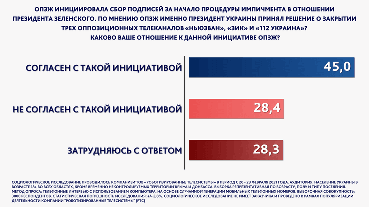 Кроме того, 45% поддерживают инициативу ОПЗЖ по процедуре импичмента в отношении Президента Зеленского за закрытие оппозиционных телеканалов "Ньюзван", "ЗИК" и "112 Украина".