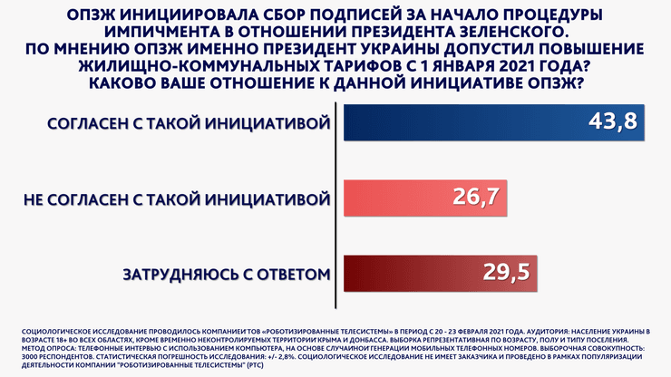 Отвечая на вопрос: "ОПЗЖ начала сбор подписей за начало процедуры импичмента в отношении Президента Зеленского. По мнению ОПЗЖ именно Президент Украины допустил распродажу земли, настаивая на принятии соответствующего закона, Каково Ваше отношение к данной инициативе ОПЗЖ?" 43,8% респондентов заявили, что поддерживают эту инициативу.