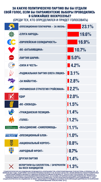 Если бы выборы в Верховную Раду Украины состоялись в ближайшее воскресенье, то наибольшее количество голосов набрала бы партия "Оппозиционная платформа — За жизнь". Об этом свидетельствуют результаты социологического опроса, проведенного компанией "Роботизированные телесистемы", проведенного 20-23 февраля 2021 года, передает "112.Украина".