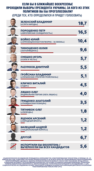 В президентском рейтинге нынешний глава государства набрал 18,7% голосов респондентов. На втором месте — Петр Порошенко — 16,5%.