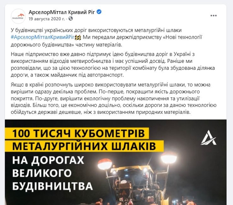 На странице криворожского производителя в Фейсбуке указано, что они поставляли для "Большого строительства" 100 тысяч кубов металлургических шлаков.