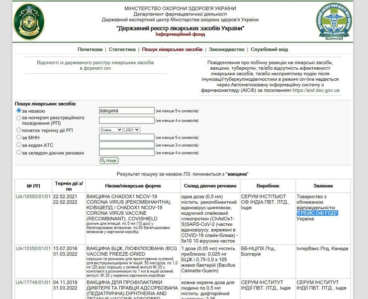 В Государственном реестре лекарственных средств Украины указано, что вакцина CoviShield, производящейся в Индии, поставляется в Украину через ООО "ГРЕЙС ОФ ГОД".