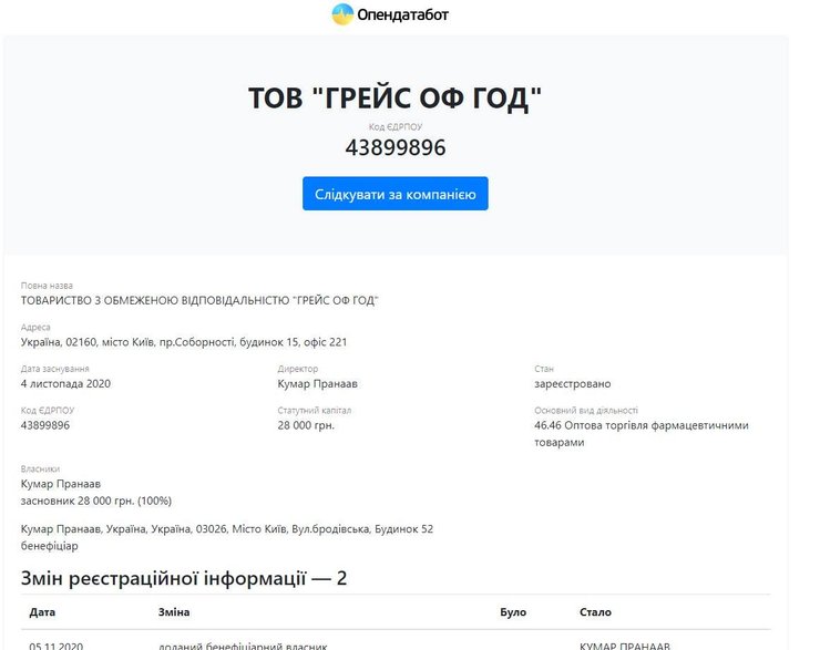 Компания "ГРЕЙС ОФ ГОД" зарегистрирована в Киеве на Левом берегу. Ее статутный капитал составляет 28 тысяч гривен. Ее основателем является Кумар Пранаав. На сайте YouControl основным видом деятельности компании указана оптовая торговля фармацевтическими товарами. Но среди других видов деятельности указана также торговля овощами, фруктами, мясом и мясными продуктами, а также других видов торговли разными товарами.