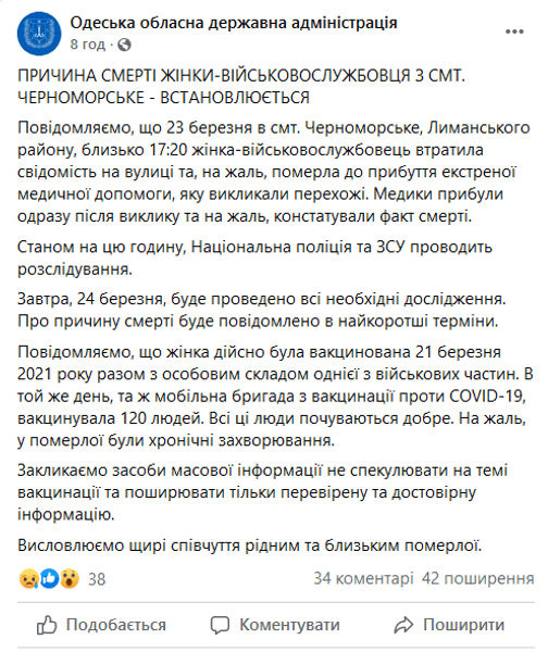 В Одесской облгосадминистрации заявили, что событие произошло в пгт Черноморское Лиманского района. В районе 17:20 военнослужащая потеряла сознание, и по данным ОГА, погибла до приезда врачей. Прибывшая на место скорая помощь констатировала смерть. У женщины была хроническая болезнь.