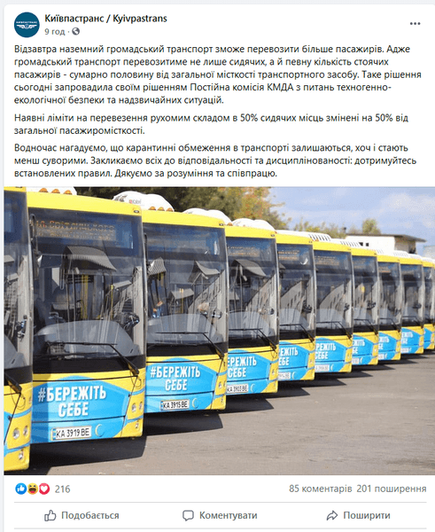 При этом в "Киевпасстрансе" отметили, что в транспорте продолжат действовать все карантинные правила.