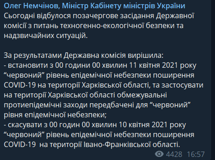 "С 00 часов 00 минут 11 апреля 2021 года "красный" уровень эпидемической опасности распространения COVID-19 на территории Харьковской области и применить на территории Харьковской области ограничительные мероприятия для "красного" уровня".