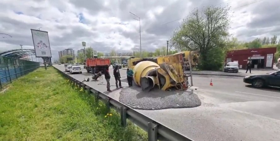 Грузовик Mercedes c миксером завалился на бок во время движения по проспекту Леся Курбаса. Полицейские предварительно установили, что водитель бетономешалки не справился с управлением и перевернул транспортное средство.