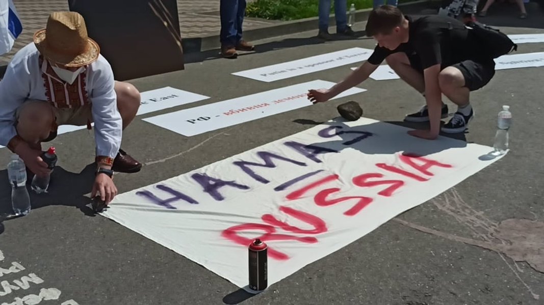 Участники акции вышли с плакатами "ХАМАС = Россия", "Израиль — мы с тобой", "РФ — убийца демократии".