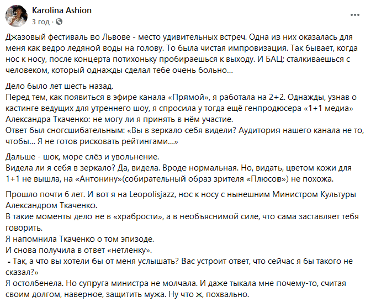 Продюсер и ведущая Каролина Ашион рассказала о встрече с министром культуры Александром Ткаченко на джазовом фестивале во Львове припомнив о ее пробах на телеканале 1+1. Об этом она написала на своей странице в Facebook.