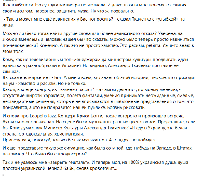 Она добавила, что при этом супруга министра не промолчала, а тыкала ей "наверное, считая своим долгом защитить мужа". По словам продюсера, действия Александра Ткаченко — это не просто хамство, это расизм, в котором она "знает толк".