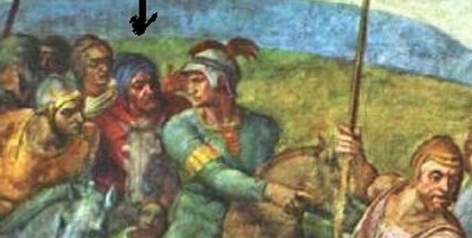 Газета The Independent поясняет, что между двумя конными фигурами у левого края картины виден третий всадник в ярко-синем тюрбане. Это и есть Микеланджело.