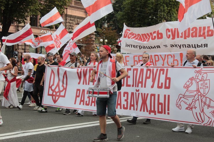 Колонну возглавляли родственники погибших ветеранов и участников Революции Достоинства, за ними шли военнослужащие получившие в боях ранения, семьи попавших в плен и тех, кто пропал без вести. За ними — медики и капелланы. Далее — ветераны, объединенные в так называемые коробки, чей порядок определяют по территориальному принципу. Среди них была коробка из граждан Беларуси.