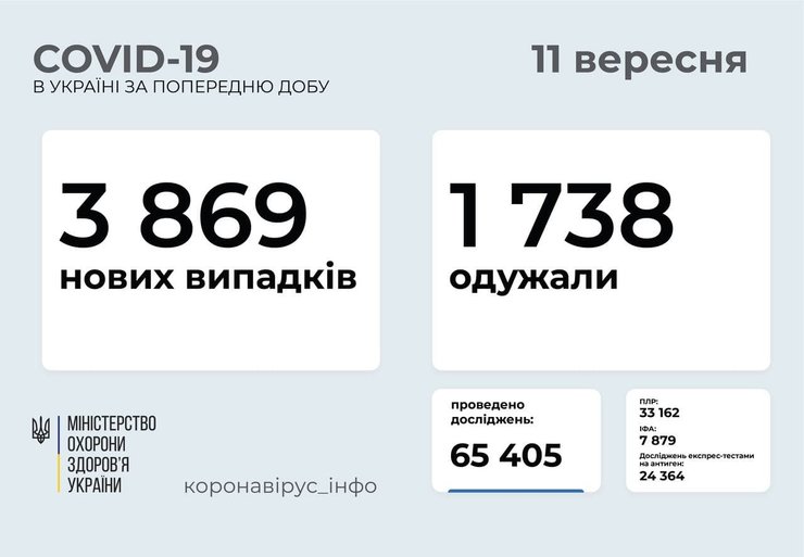 Статистика коронавируса на 11 сентября: 3869 новых случаев, 1102 госпитализации