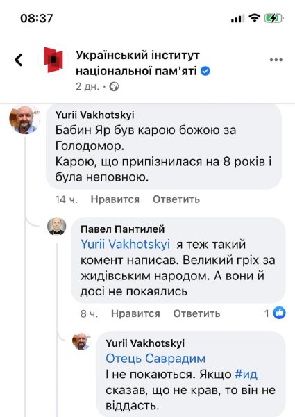 Бывший заместитель мэра Шепетовки Юрий Вахоцкий и клирик ПЦУ Павел Пантилей дали новую историческую оценку трагическим событиям в период Второй мировой войны в Бабьем Яру. Исходя из комментариев "историков", причиной массовых расстрелов в Бабьем Яру стали прегрешения еврейского народа. Об этом сообщается в публикации Главы Всеукраинского еврейского конгресса Эдуарда Долинского.
