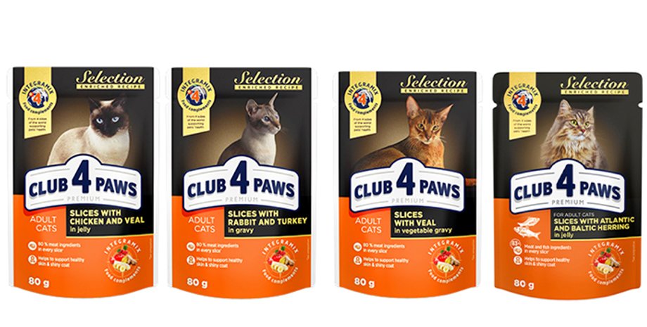 Владельцам избалованных кошек, которым трудно угодить с едой, а также всем, кто хочет порадовать питомца вкусным и полезным угощением, стоит обратить внимание на линейку влажных кормов Selection от Клуб 4 Лапы. Они изготавливаются из отборных ингредиентов, обогащены ценными, полезными для здоровья добавками, отличаются от рационов базовой линейки того же бренда более высоким содержанием мяса и мясных ингредиентов. Сочные кусочки натурального мяса или рыбы в ароматном желе или соусе покоряют сердца и желудки даже самых привередливых кошек.