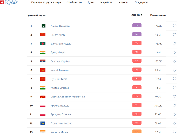 В "антирейтинге" IQAir лидирующие места занимают города из Пакистана, Китая, Бангладеша, Индии и Польши.