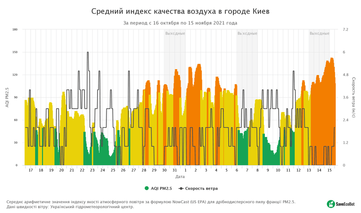 При отслеживании показателей загрязненности в реальном времени оказалось, что по состоянию на 12:55 15 ноября, индекс Киева составляет 111 единиц, в то время как допустимое значение – 50. Это значит, что воздух в столице представляет определенную опасность "для чувствительных групп населения".