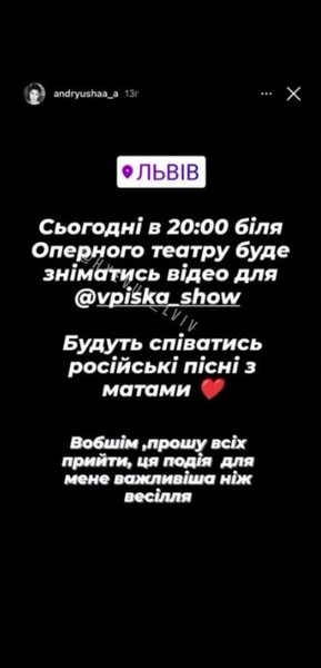 "Сегодня в 20.00 возле Оперного театра будет сниматься видео для Вписка-шоу. Будут русские песни с матами. Прошу всех прийти, для меня это очень важное событие важнее, чем свадьба", — написал в своем сториз в Instagram пользователь с ником andryushaa_a.