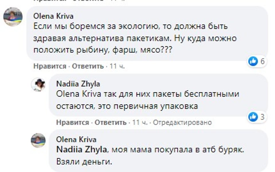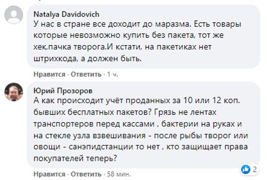 "У нас в стране все доходит до маразма. Есть товары которые невозможно купить без пакета, тот же хек, пачка творога. И кстати, на пакетиках нет штрих-кода, а должен быть", "А как происходит учет проданных за 10 или 12 коп. бывших бесплатных пакетов? Грязь не лентах транспортеров перед кассами , бактерии на руках и на стекле узла взвешивания — после рыбы творог или овощи — санэпидстанции то нет, кто защищает права покупателей теперь?", – отмечают третьи.