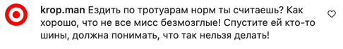 - "Ездить по тротуарам норм ты считаешь? Как хорошо, что не все мисс безмозглые! Спустите ей кто-то шины, должна понимать, что так нельзя делать!"