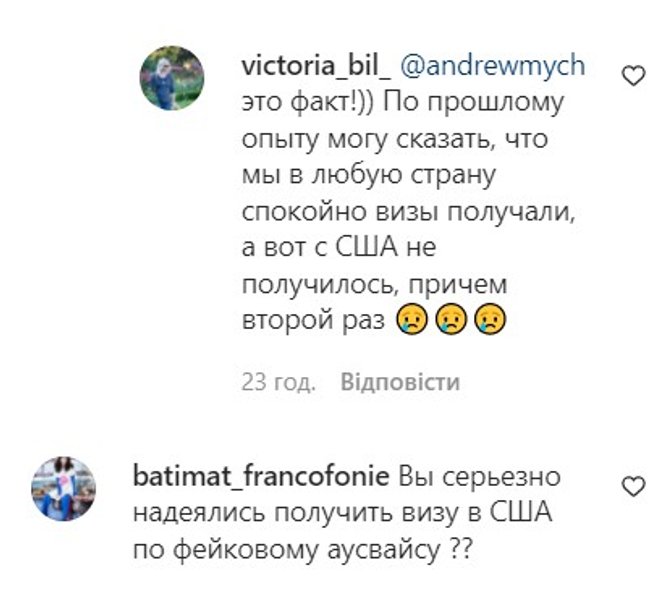 В комментариях пользователи интересуются, действительно ли организаторы верили, что смогут получить визу по российскому паспорту, ведь Крым – территория Украины на что Биль ответила: в 2021-м визу они пытались открыть ее в Украине, но тоже безуспешно.