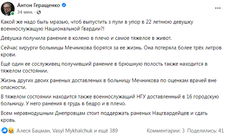 "Девушка получила ранение в колено, в плечо и самое тяжелое – в живот. Сейчас хирурги больницы Мечникова борятся за ее жизнь. Она потеряла более трех литров крови. Еще один ее сослуживец получивший ранение в брюшную полость также находится в тяжелом состоянии", – сообщил Геращенко.