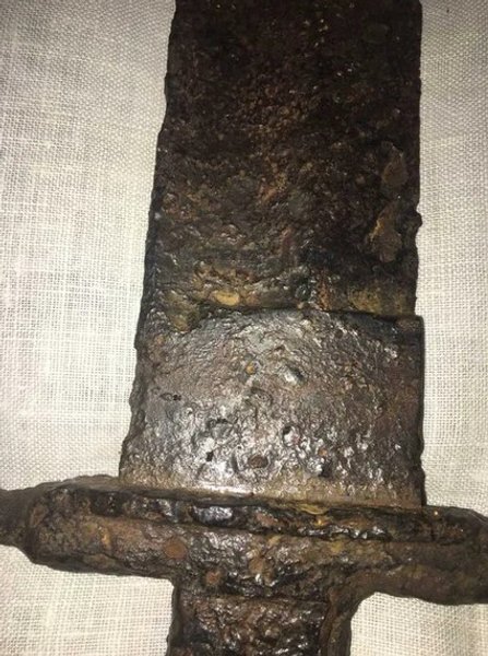 Разломанный на две части клинок нашли с помощью металлоискателя и "восстановили" с помощью сварки. После появления меча в доме в нем "все заболели".