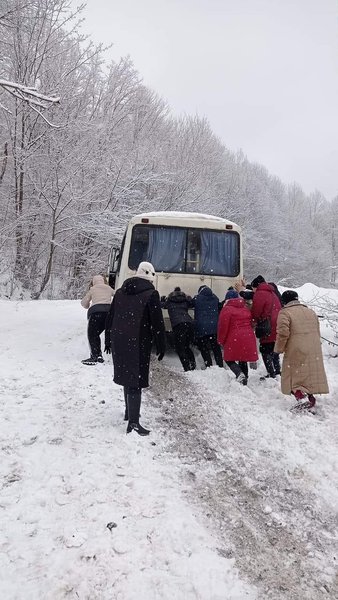 На Закарпатье десять женщин вытолкали пассажирский автобус, который застрял в снежном сугробе, сообщает Facebook-канал Varta Zakarpattia.
