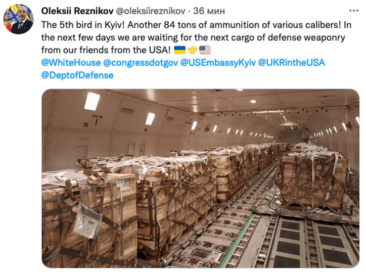 По словам министра обороны Алексей Резникова, на борту прибывшего самолета находились 84 тонны боеприпасов.
