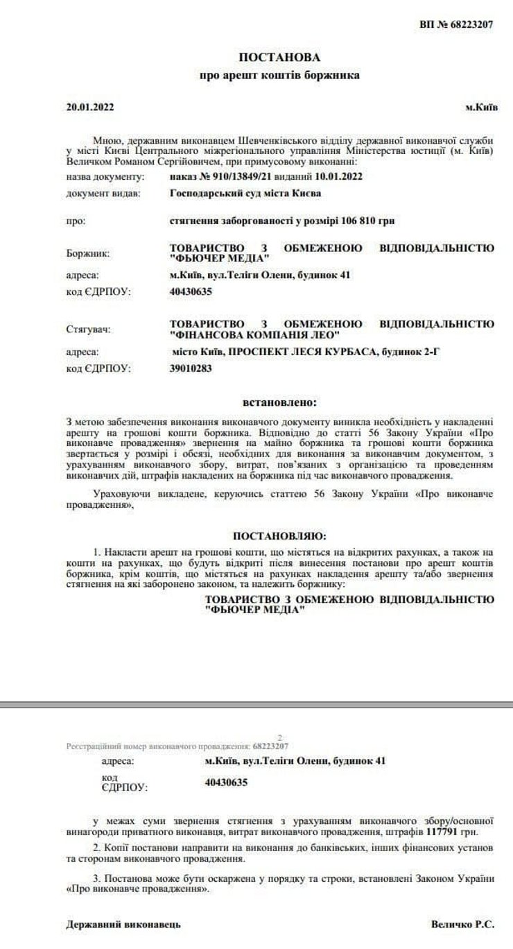 Шевченковское отделение государственной исполнительной службы в городе Киеве наложило арест на счета ООО "Фьючер Медиа", которому принадлежит издание mind.ua, в рамках исполнения решения Хозяйственного суда г. Киева по делу № 910/13849/21 о взыскании с данного ООО в пользу ООО "ФК Леогейминг Пей" в качестве морального ущерба и судебных издержек в размере 106 810 грн, а также затрат исполнительной службы на взыскание этих средств. Об этом говорится в постановлении об аресте средств должника в рамках исполнительного производства № 68223207, передает сайт 112.ua.