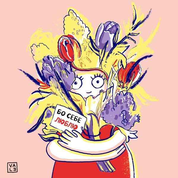 Другая участница проекта, иллюстраторка Ирина Вале, специализирующаяся на скетчинге, кривых и смешных рисунках, также предлагает альтернативный взгляд на романтическую традицию. В ее работе девушка сама себе дарит букет цветов и при этом счастлива в этот момент. В лепестках мы видим открытку с надписью "бо себе люблю".