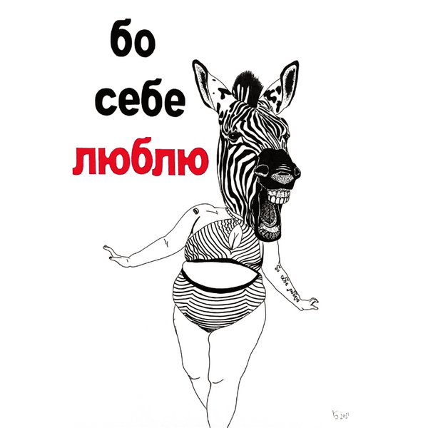 Художник Евгений Барабан в своей работе апеллирует через постирению к бодипозитивным трендам. Его зебра — это свободная женщина, любящая себя и свое тело, и верная своим канонам красоты, а не общественным ожиданиям.