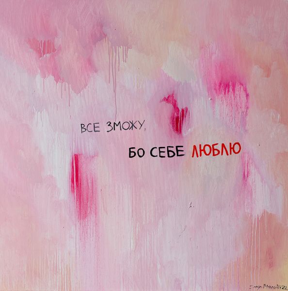 "Я живу и самовыражаюсь так, как хочу — это свобода действий, не делаю ничего во вред себе", — добавляет Соня. Ее картина написана на широком полотне маслом — нежно-розовый фон и лаконичная надпись: "Все зможу, бо себе люблю".