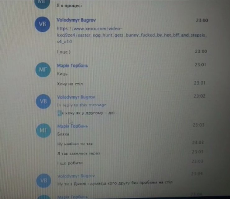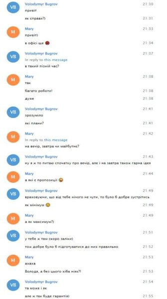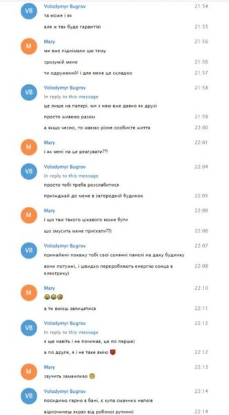 Telegram-канал предоставил скрины переписки пользователя Volodymyr Bugrov с Mary и "Катей Ягідкой 1 курс". В частности, Mary пишет о том, что Bugrov женат и ей "будет сложно". Но Bugrov все же приглашает ее в загородный дом показать "солнечные панели на крыше".
