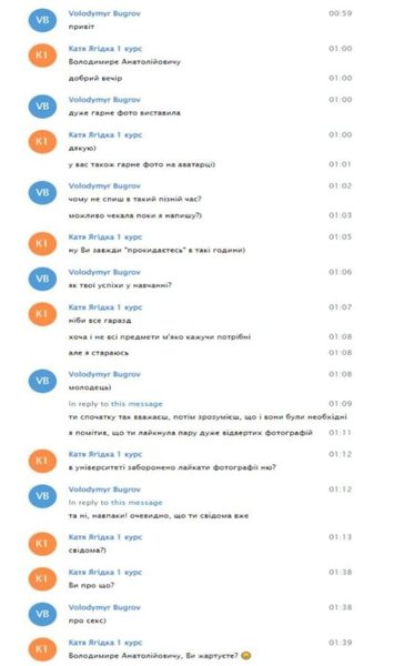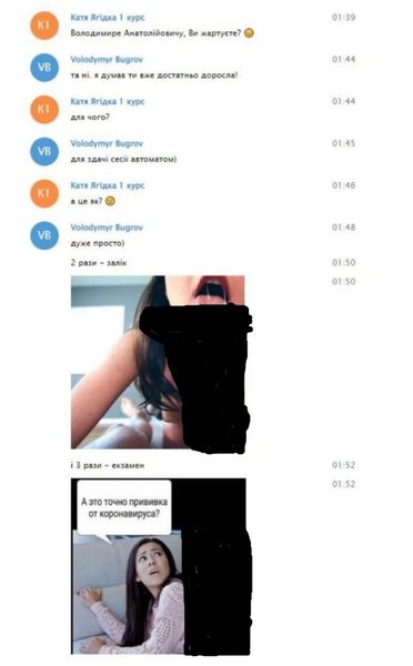 В чате с "Катей Ягідкой 1 курс" Bugrov прямо намекает, что надо сделать, чтобы "сдать сессию автоматом" и присылает порнографические картинки.