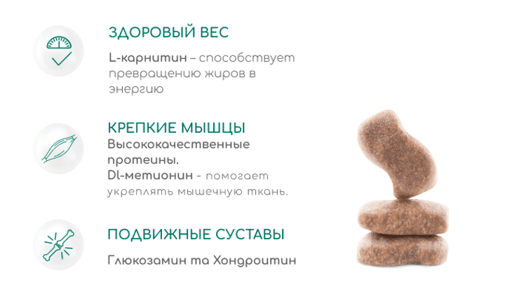 Optimeal Beauty Fitness Healthy Weight & Joints (здоровый вес и суставы) отличается повышенным содержанием белков (дополнительным источником белка служат бобовые) и пониженным – жиров. Это наименее калорийный корм в линейке, сбалансированный для контроля веса. Благодаря повышенному содержанию растворимой и нерастворимой клетчатки корм улучшает перистальтику, вызывает ощущение сытости, а аминокислота L-карнитин активизирует расщепление жиров. Помимо контроля веса корм обеспечивает поддержку суставов благодаря добавке хондропротекторов (глюкозамин и хондроитин, компоненты хрящевой ткани). В комплексе с дополнительными физическими нагрузками рацион поможет поддерживать здоровый вес животных, которые ведут малоактивный образ жизни и склонны к набору веса.