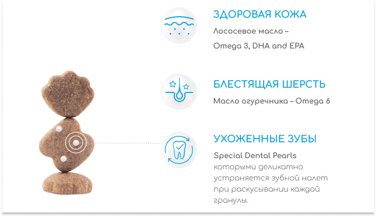 Optimeal Beauty Podium Shiny Coat & Dental Care (блестящая шерсть и забота о зубах) – корм для собак сухой из гранул двух видов с уникальной добавкой Dental pearls (микрокристаллы целлюлозы). Это инновационная разработка от Optimeal, впервые использованная именно в кормах Podium. За счет продуманной формы и размеров гранул в процессе их разгрызания зубы очищаются со всех сторон, а микрокристаллы Dental pearls обеспечивают деликатное, но эффективное удаление зубного налета. Также корм отличается повышенным содержанием продуктов, богатых омега кислотами (масло лосося, огуречника, семя льна). Жирные кислоты благотворно влияют на состояние кожи и шерсти.