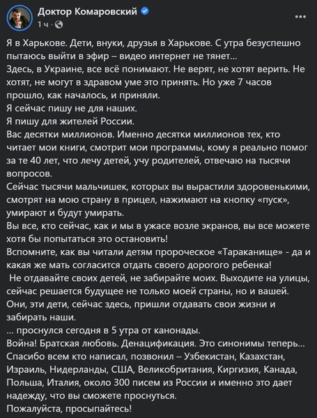 "Я сейчас пишу не для наших. Я пишу для жителей России. Вас десятки миллионов. Именно десятки миллионов тех, кто читает мои книги, смотрит мои программы, кому я реально помог за те 40 лет, что лечу детей, учу родителей, отвечаю на тысячи вопросов. Сейчас тысячи мальчишек, которых вы вырастили здоровенькими, смотрят на мою страну в прицел, нажимают на кнопку "пуск", умирают и будут умирать. Вспомните, как вы читали детям пророческое "Тараканище" – да и какая же мать согласится отдать своего дорогого ребенка. Не отдавайте своих детей, не забирайте моих. Выходите на улицы, сейчас решается будущее не только моей страны, но и вашей. Они, эти дети, сейчас здесь. Пришли отдавать свои жизни и забирать наши…. Пожалуйста, просыпайтесь!", – говорится в публикации.