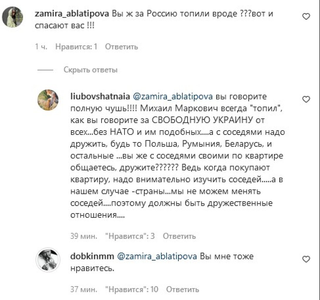 В ответе на комментарий с указанием того, что Добкин "топил" за Россию "защитник" политика написал: "Михаил Маркович всегда "топил", как вы говорите за свободную Украину от всех…без НАТО и им подобных, а с соседями надо дружить, будь то Польша, Румыния, Беларусь, и остальные, вы же с соседями своими по квартире общаетесь, дружите?".