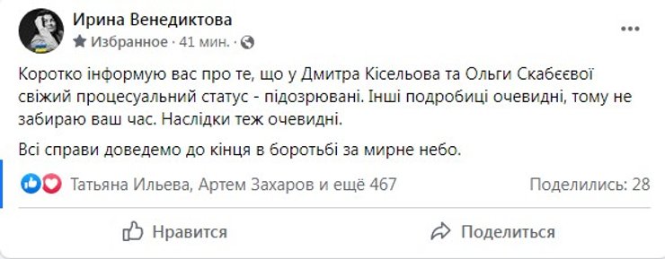 "У Дмитрия Киселева и Ольги Скабеевой свежий процессуальный статус – подозреваемые. Другие подробности очевидны, поэтому не отнимаю ваше время. Последствия тоже очевидны. Все дела доведем до конца в борьбе за мирное небо", – написала генпрокурор.