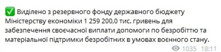 "Выделено из резервного фонда государственного бюджета Министерству экономики 1,259 млрд гривен для обеспечения своевременной выплаты пособия по безработице и материальной поддержки безработных в условиях военного положения", – сообщил он.