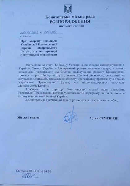Конотопский горсовет запретил деятельность Украинской православной церкви московского патриархата. Такое распоряжение подписал мэр Конотопа Артем Семенихин.