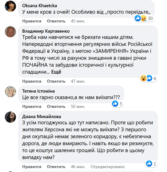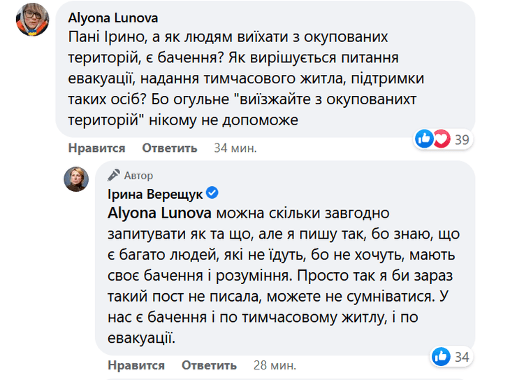 "Можно сколько угодно спрашивать как и что, но я пишу так, потому что знаю, что есть много людей, которые не едут, потому что не хотят, имеют свое видение и понимание. Просто так я сейчас такой пост не писала бы, можете не сомневаться. У нас есть видение и по временному жилью, и по эвакуации", — подчеркнула она.