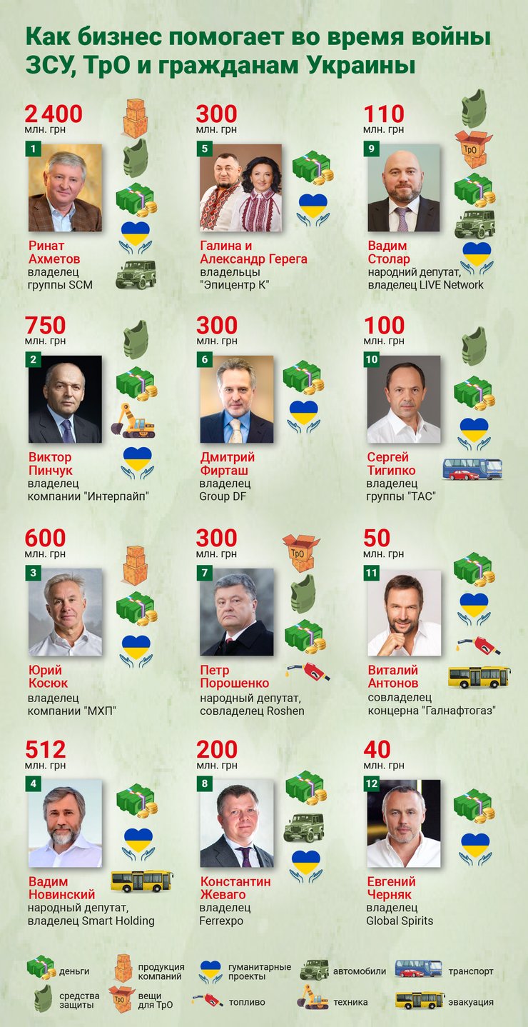 Огромную работу для поддержки украинских защитников совершают частные украинские компании. Фокус собрал в едином рейтинге 12 имен тех, кто вкладывает свои деньги, силы и время в проекты, которые непременно должны приблизить победу Украины.