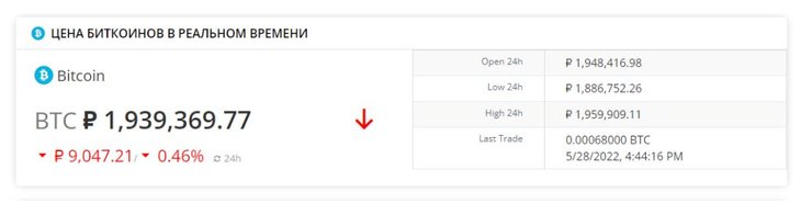 Под конвертером находится таблица, отражающая цену биткоина в реальном времени. Она показывает цену в данный момент, цену открытия, минимальную, максимальную стоимость этой валюты. А еще можно увидеть, как изменилась цена за последние 24 часа.